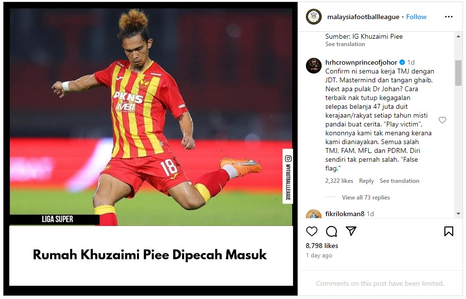 “一切都是柔佛王储、大马足总(FAM)、马来西亚足球联盟(MFL)和警方的错。他们自己从来没有做错过任何事,假旗行动(false flag)。”