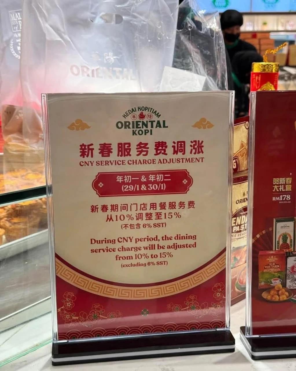 事缘,本地著名咖啡连锁店早前在柜台摆放告示牌,提醒顾客年初一(1月29日)和年初二(1月30日)期间,用餐服务费将从原本的10%调涨至15%。而这项宣布,也随即引起许多人的关注。
