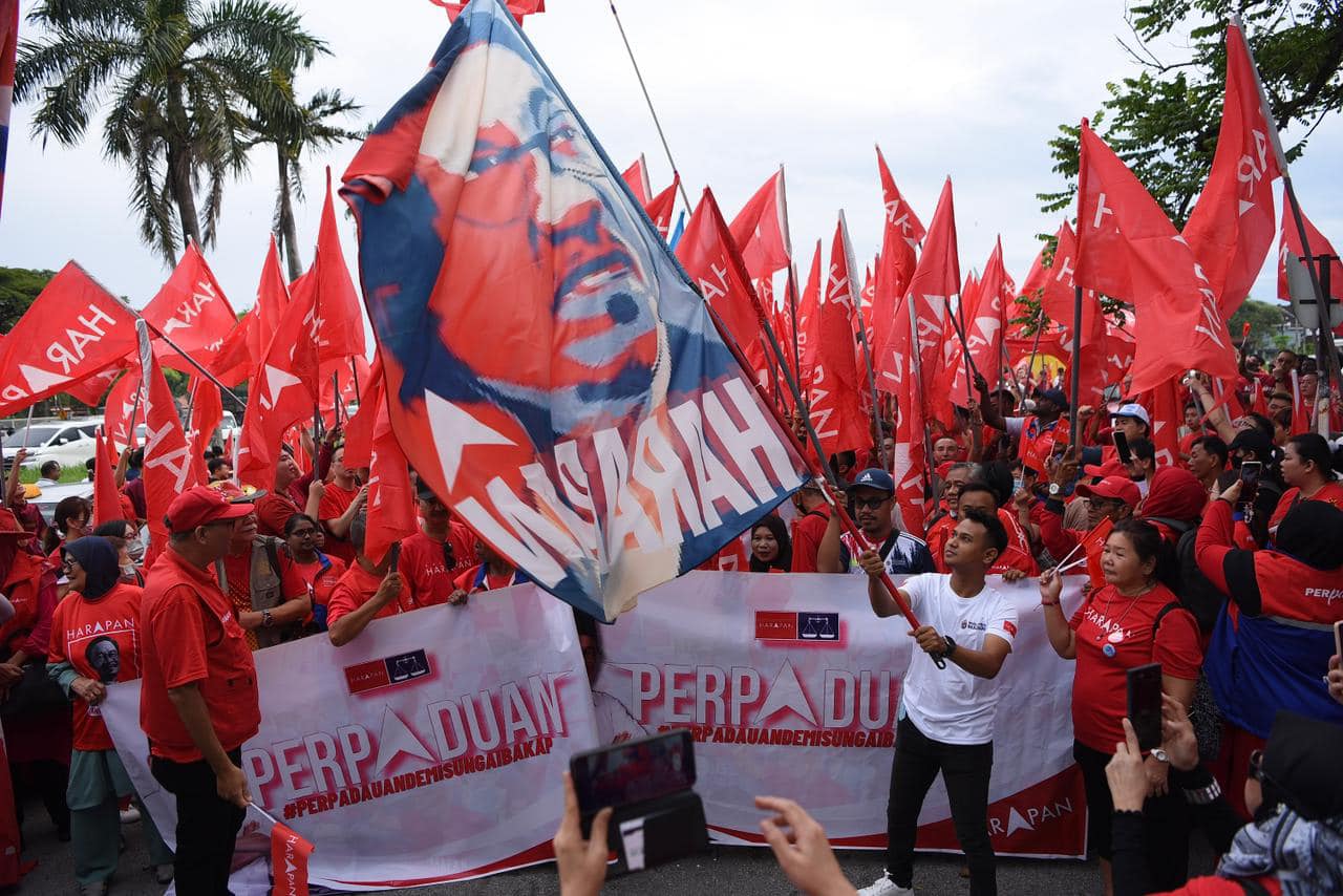 提名中心外也出现一片“红海”。据悉,现场有超过2,000名支持者聚集,并高举希盟旗帜,摇旗呐喊“Cikgu Joo,Sungai Bakap”。