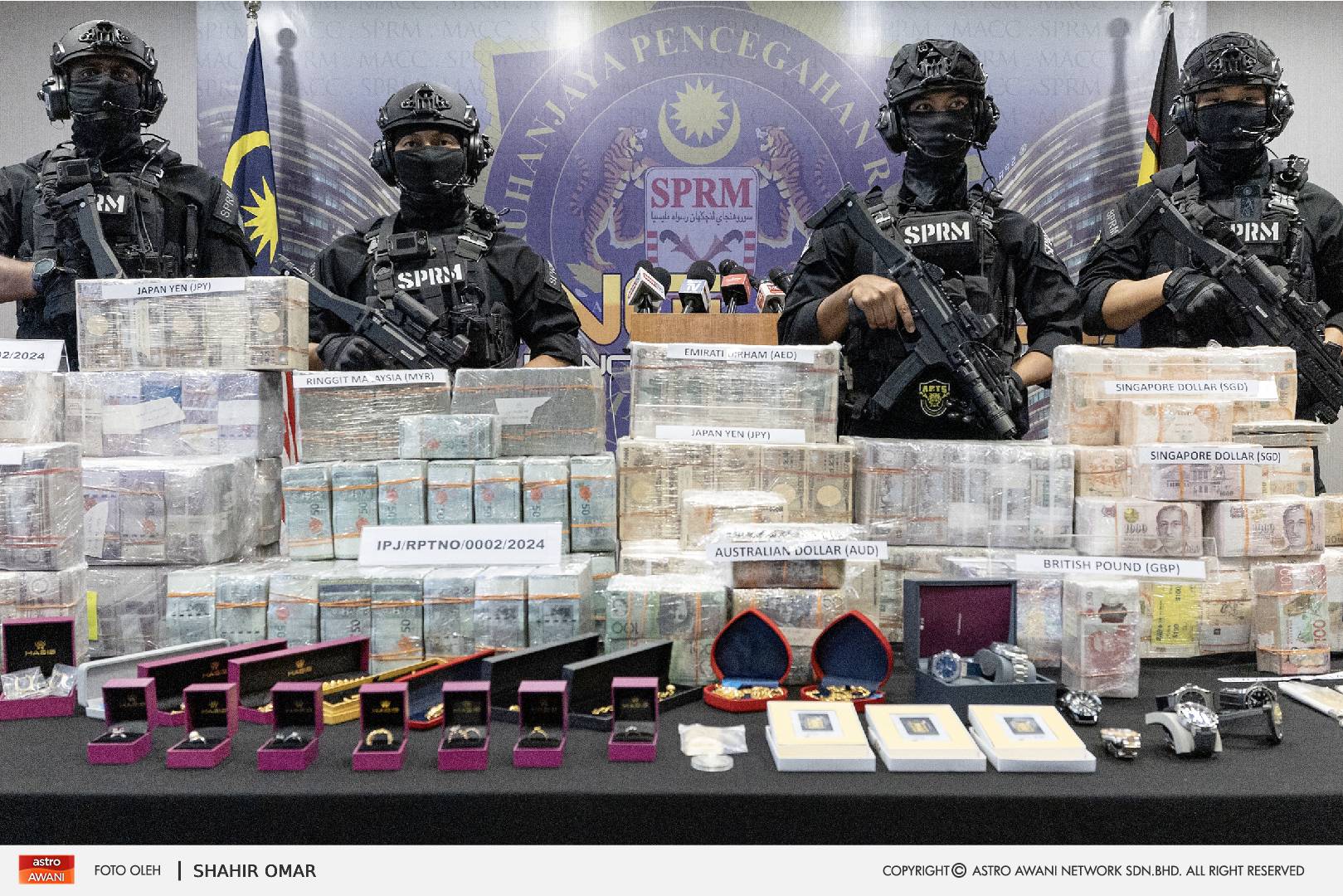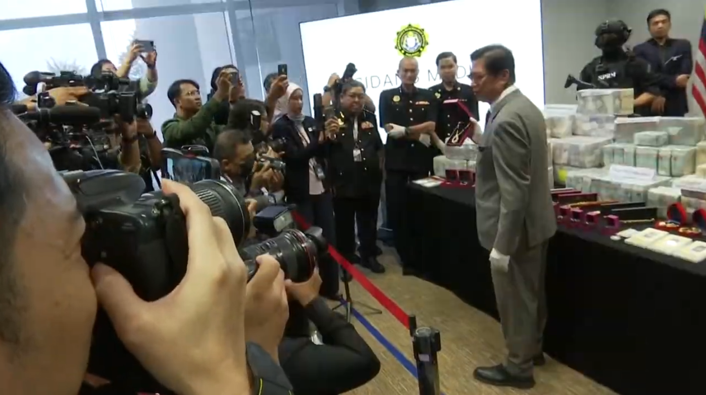 反贪会今日针对前首相依斯迈沙比里涉及的贪污案,召开堪称史上“最奢华的记者会”。现场不但展示反贪会搜获的大量各国现钞,还有金条、金饰和名表等,让人看傻了眼。