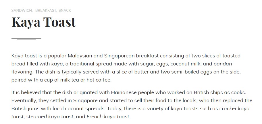 根据“Taste Atlas”网站介绍,咖椰土司是源自当时在英国船上担任厨师的海南人,他们后来定居新加坡,并开始销售这种独特的土司。