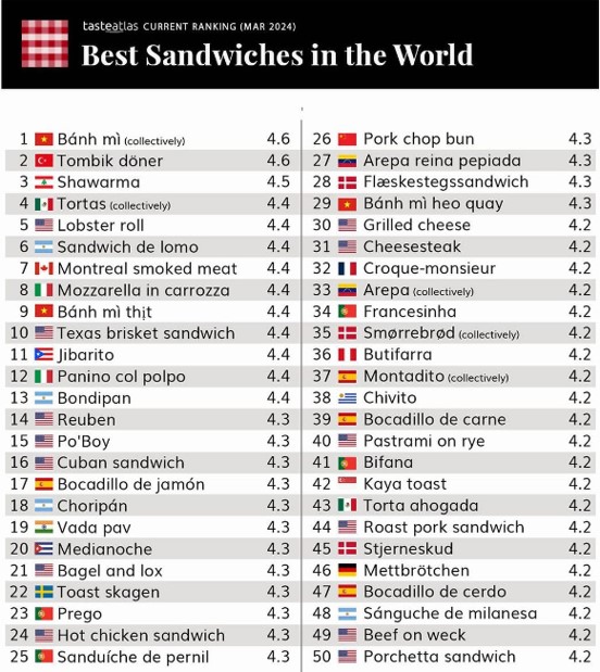 国际美食网站“Taste Atlas”昨天(3月11日)公布2023年/2024年全球认可最美味的50种三明治。