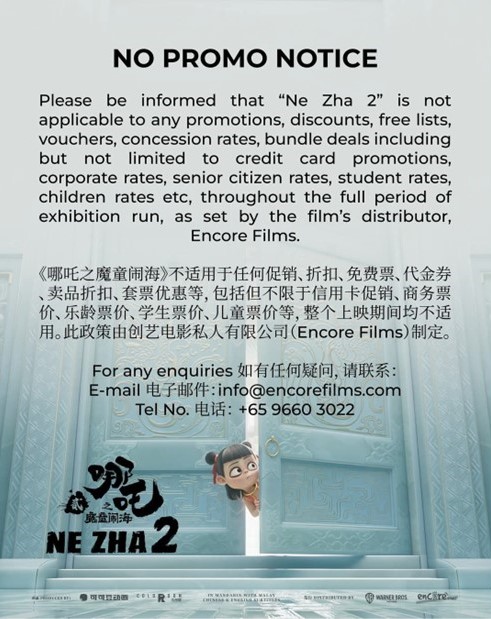 由于讨论度过高,本地片商Encore Films在社媒发布通告,《哪吒2》不适用于任何促销、折扣或特殊票价,只会以原价格出售,就连周三优惠日也不会享有折扣票价。