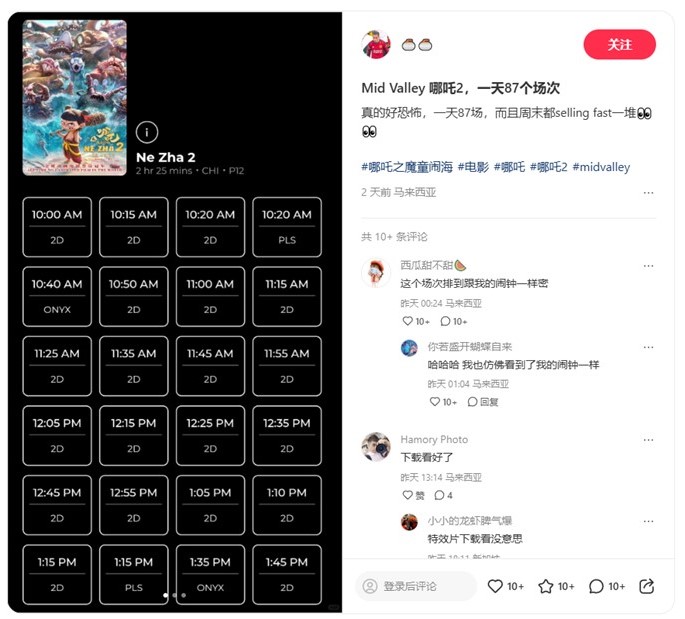 其中吉隆坡谷中城购物中心(Mid Valley Megamall)在上映首日,更是罕见地开了87个场次,几乎每隔十分钟就有一场,让不少网友傻眼调侃,电影的场次排到跟自己的闹钟一样密。