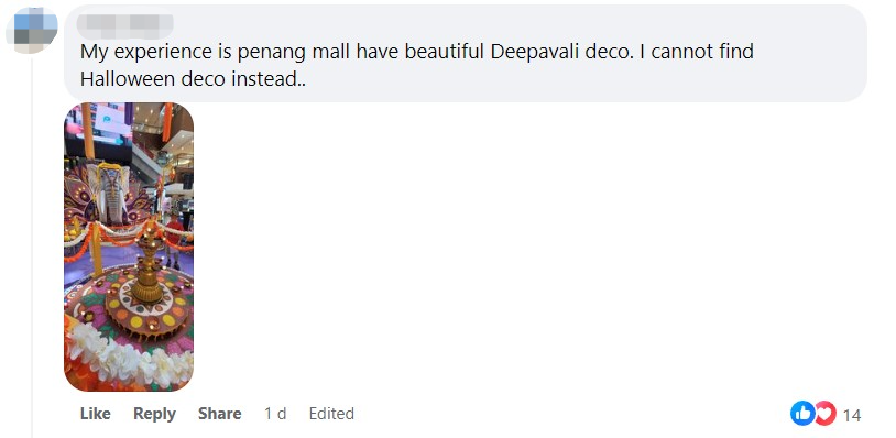 一名网民在面子书群组发帖表示,她到附近的商场逛街时惊讶地发现,商场内竟然只有圣诞节的装饰,却忽略了即将到来的屠妖节,这让她感到非常失望。