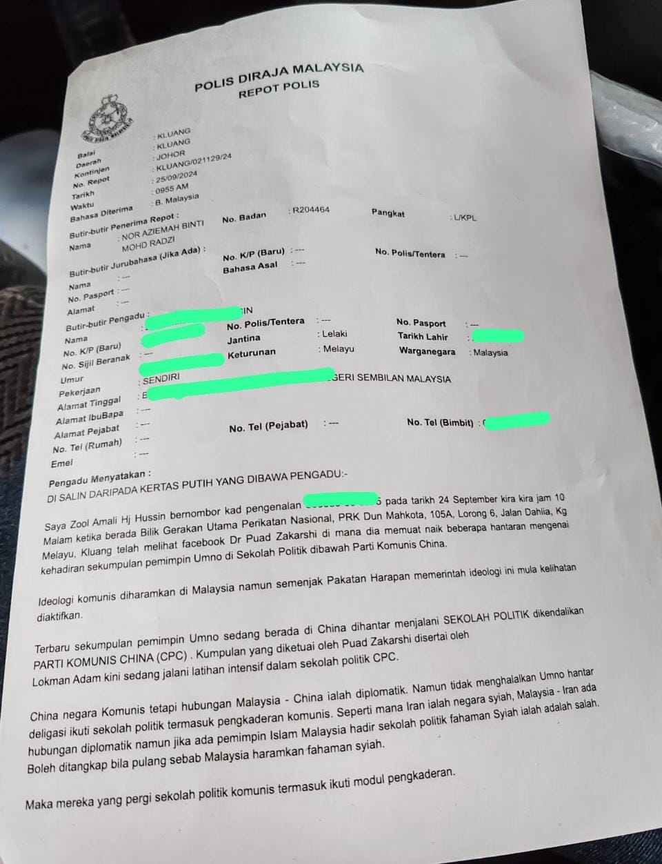巫统最高理事卜艾(Mohd Puad Zarkashi)最近率团前往中国政治学院考察,引起争议,有国盟领袖声称卜艾可能回国后散播共产主义,因而向警方报案。