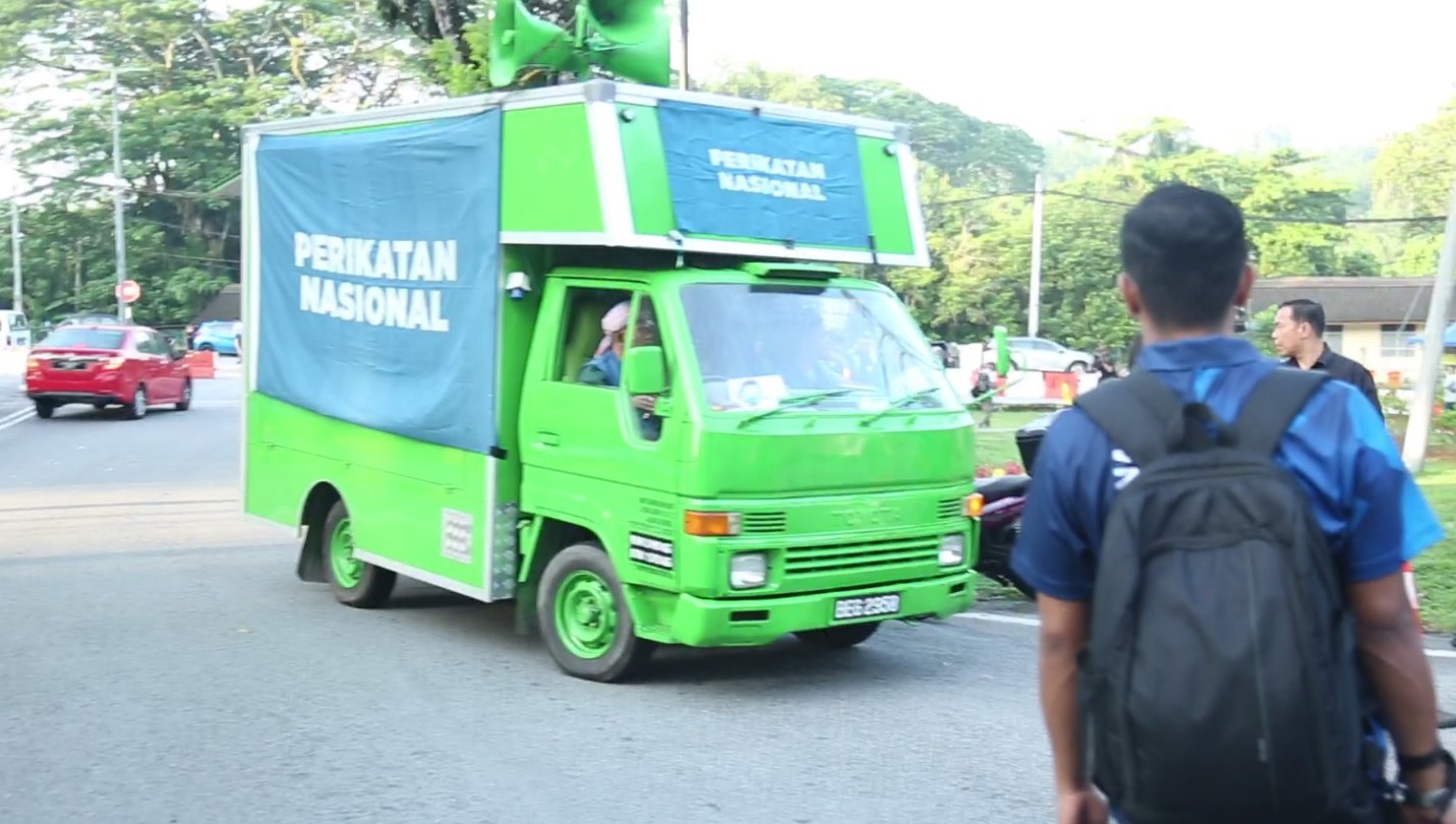 国盟助选团卯足全力,除了频频喊出“Refomati”(改革已死)、Menteri Uni Kayu(木薯部长)等玩味口号之外,他们也出动“绿色战车”广播号召所有支持者到现场,为国盟候选人凯鲁阿扎里加油打气。