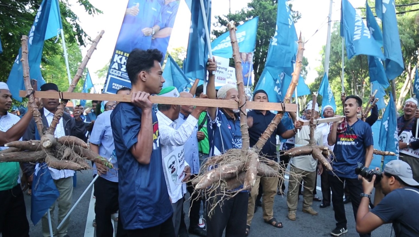 今早除了有国盟多名领袖现身新古毛州席补选提名中心,为候选人撑场之外,不少支持者一大早就扛着木薯到场,借此调侃国会下议院议长佐哈里的“木薯代替白米论”。