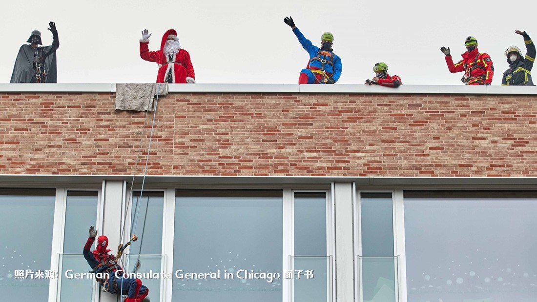 因为疫情,圣诞老人无法到医院探访,德国消防员便装扮成圣诞老人和超级英雄等角色,透过游绳与医院里的孩子和医护人员打招呼,送上礼物和祝福。
