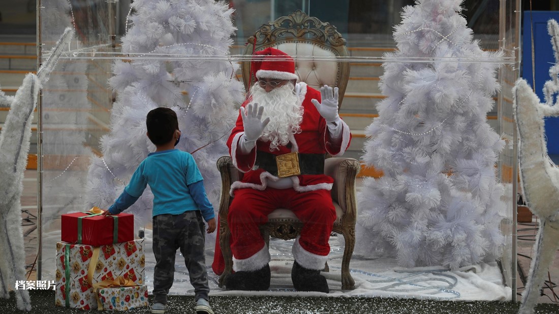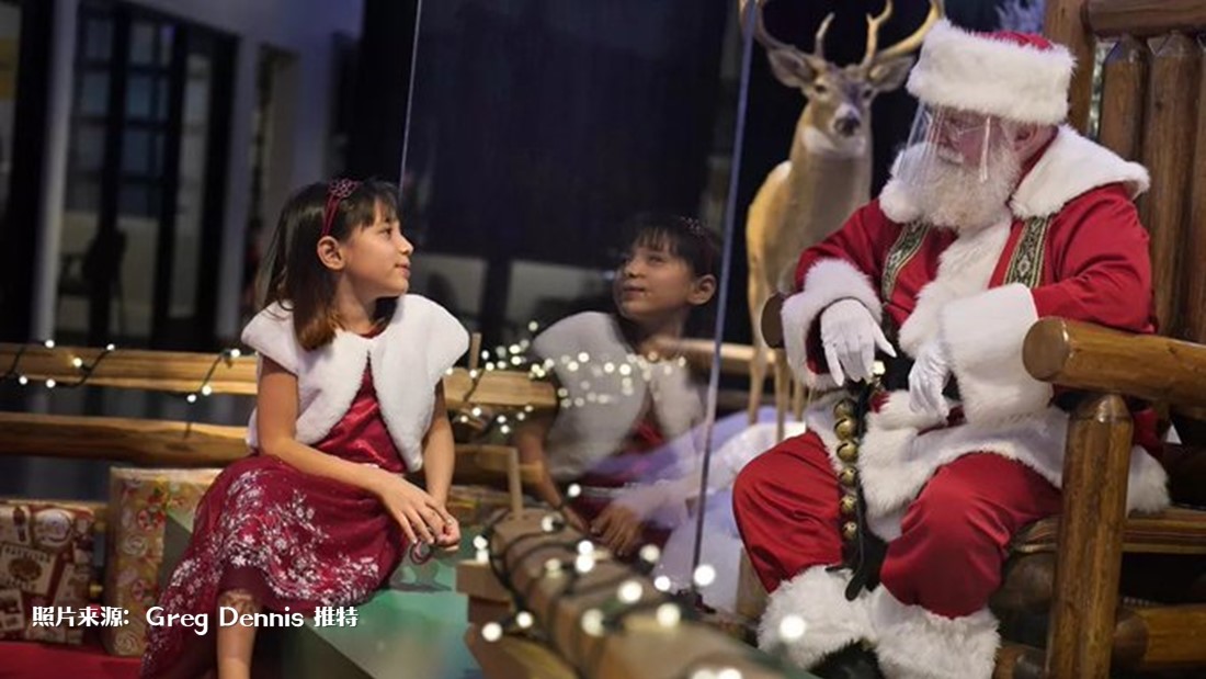 由于美国多地疫情严重,各州购物商场做足防疫措施,圣诞老人必须戴上面罩,隔着胶板和民众互动。有些购物商场也以线上的方式,让小朋友透过屏幕与圣诞老人聊天许愿。