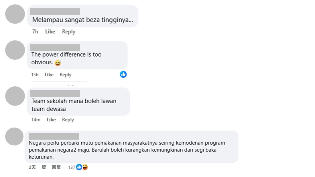赛后,大马排总在官方面子书,上传我国选手与中国选手的合照以及赛场照,然而画面中双方的体格差距悬殊,遭网民形容“像是学生对与成人队比赛”,并呼吁当局向其他体育先进国学习体育科学,以及现代化水平的营养计划,以确保大马运动员营养均衡,从源头上减少体格上的先天差距。