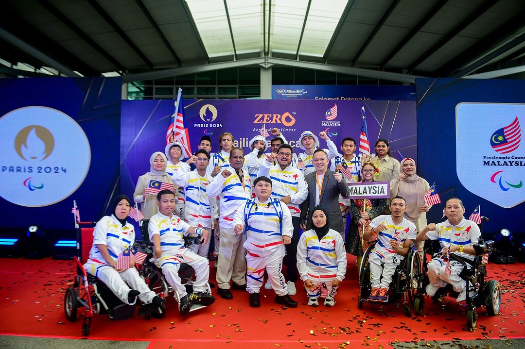 大马残奥理事会主席梅格达尼夫(Megat D Shahriman)出席“巴黎残奥会倒数50天”活动,与身穿官方制服的大马残奥运动员合影。
