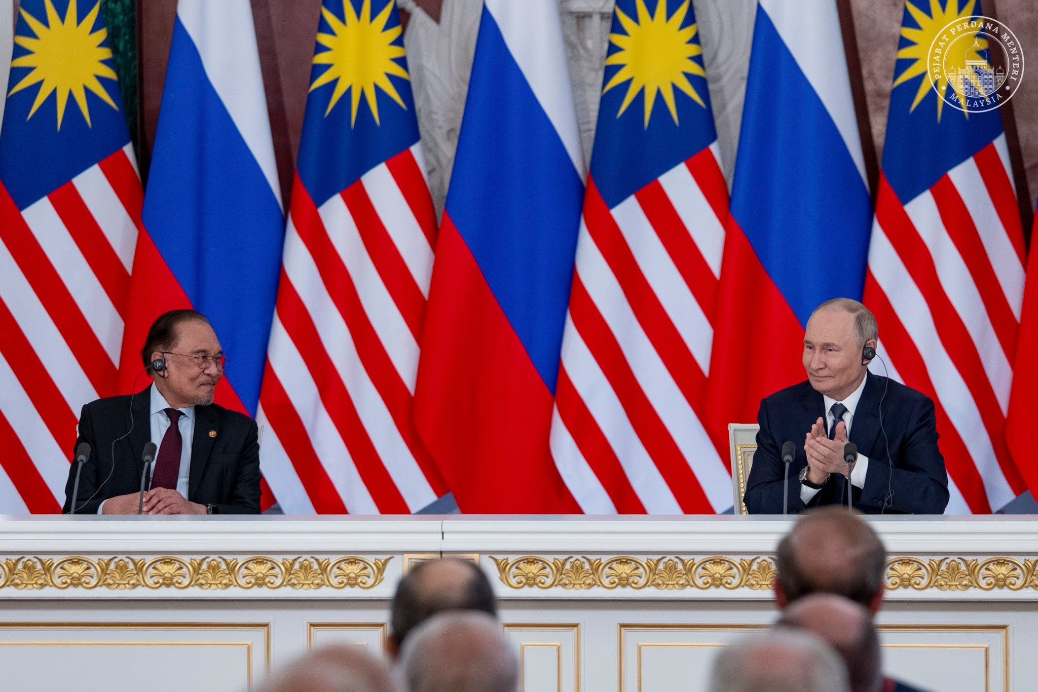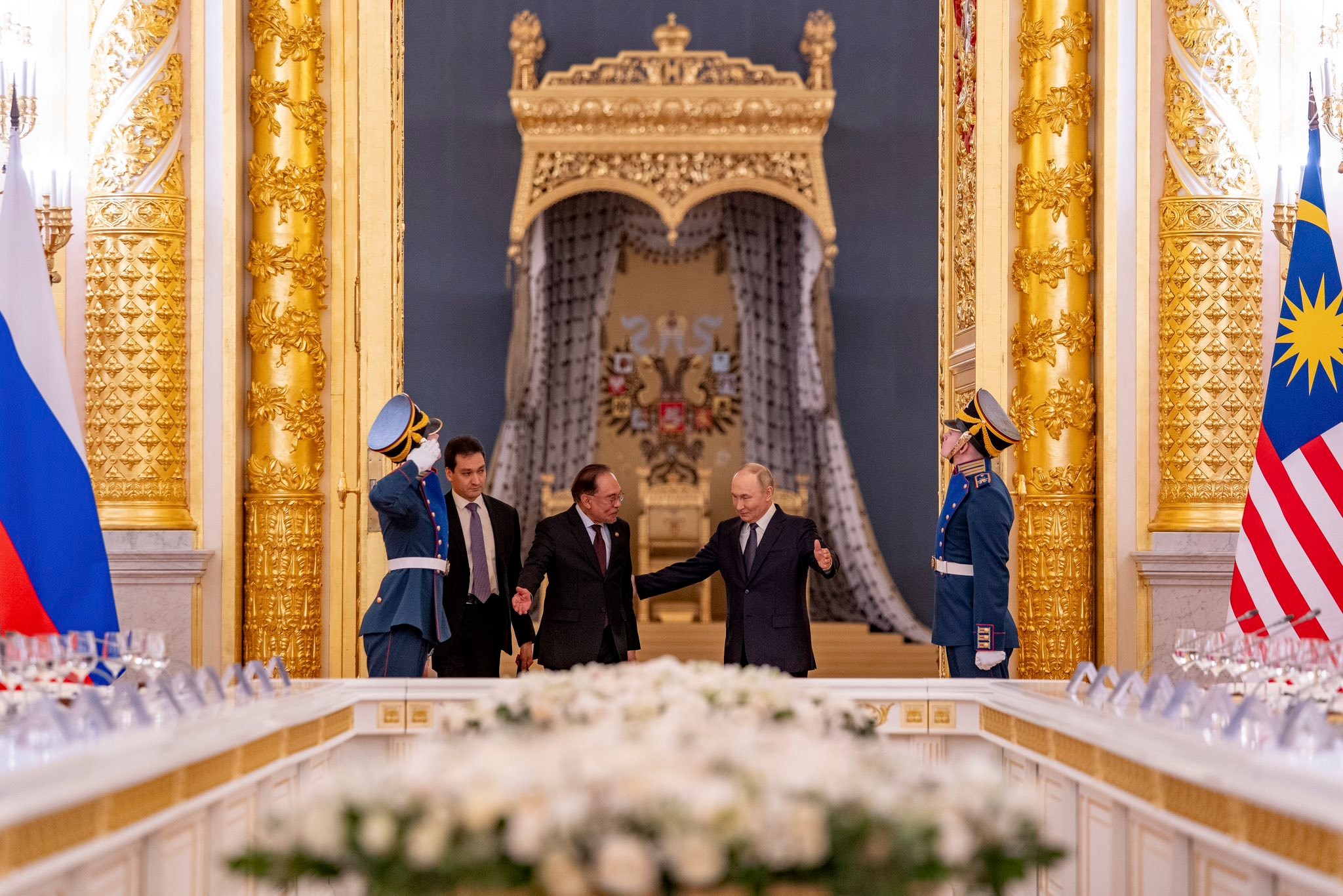 来到联合记者会尾声,普京分享了一段,他带安华参观克里姆林宫圣安德鲁大厅时的趣事。普京表示,他当时指着厅内的三张宝座,介绍其中两张分别属于沙皇和皇后,但第三张却未注明所属,便请安华猜测。