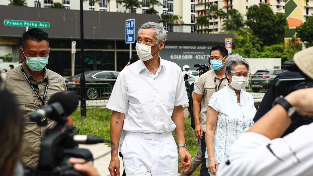12.06PM:新加坡总理李显龙和夫人何晶现身投票站,两人都戴口罩以及保持社交距离。