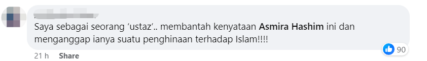“我作为一名‘宗教师’,我反对阿斯米拉(Asmira Hashim)的言论,并认为这是对伊斯兰教的侮辱!!!”