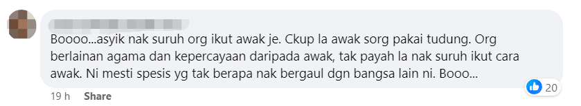 “你一直要求别人跟随你的方式,你一个人戴头巾就够了,别人有跟你不同的宗教和信仰,不需要按照你的方式去做。这肯定是一个不愿与其他种族相处的人。”