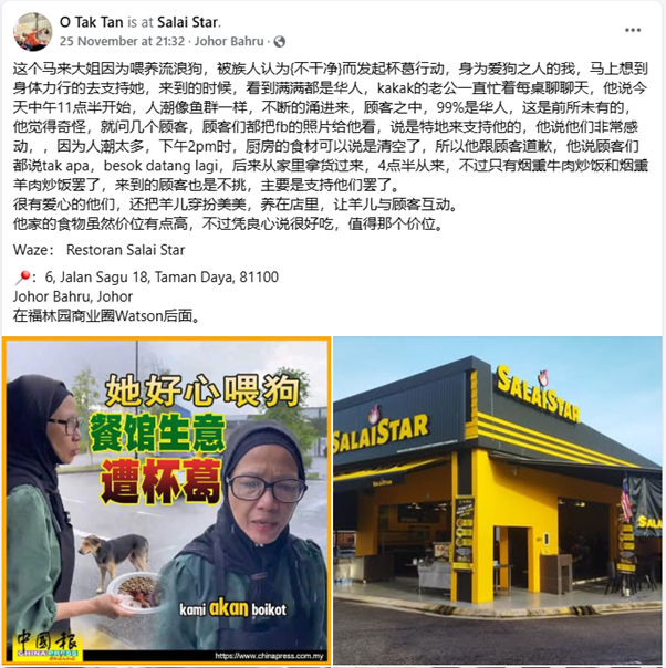 看更多: 因喂流浪狗餐厅遭抵制 华裔顾客光顾力挺马来女老板"