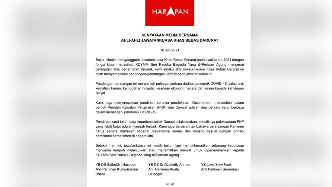 他们补充,为了符合大马的民主议会原则,国会应立即召开,以发挥监督与制衡的角色。