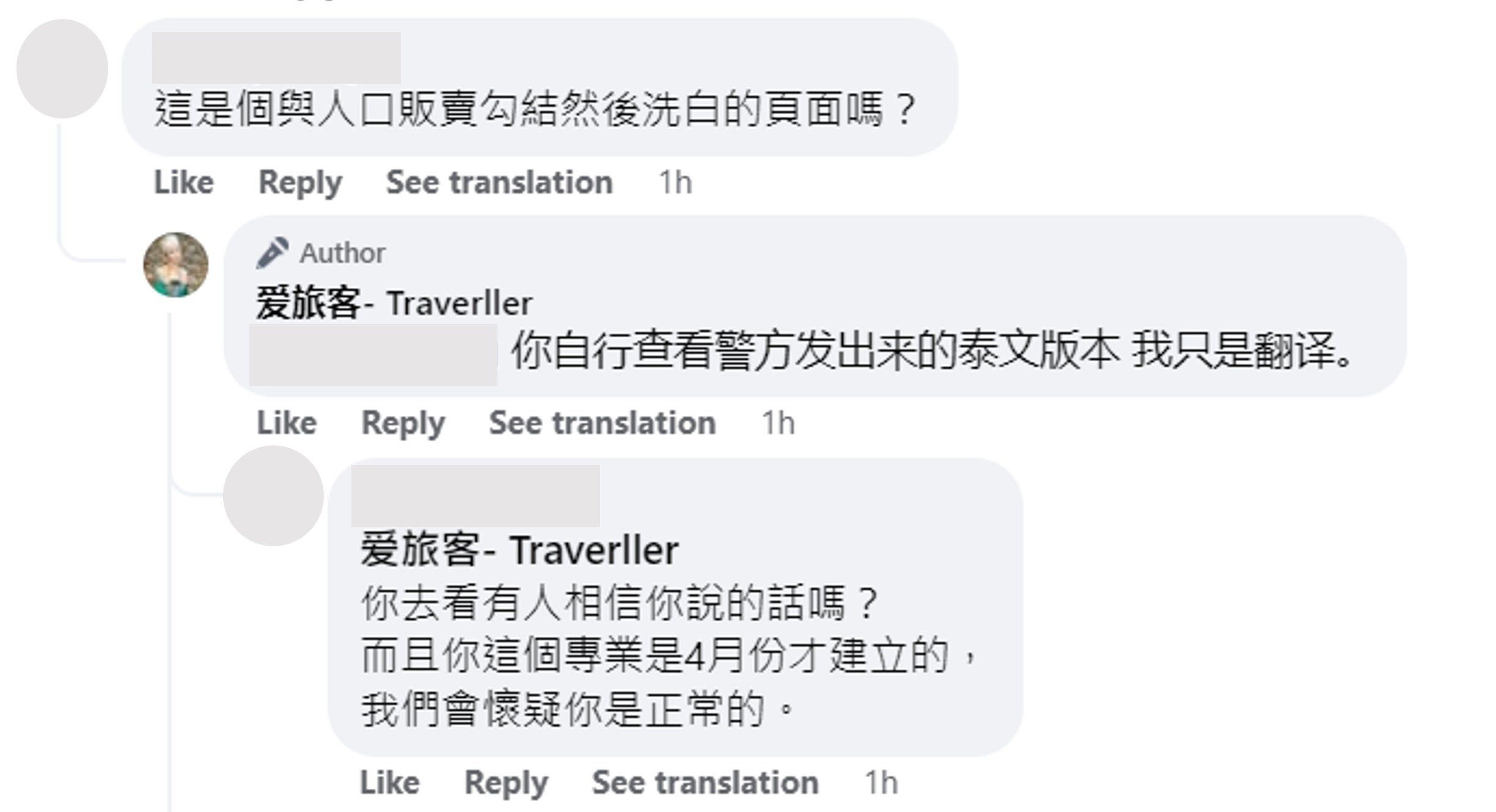不仅如此,网民质疑,该社交群组只不过是与人口贩卖勾结并为其洗白。而该社交群组也不甘示弱回应,自己只是照着泰国警方的文告翻译。