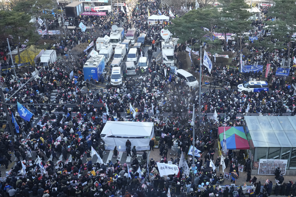 首尔国会外聚集大批民众,要求通过弹劾议案。