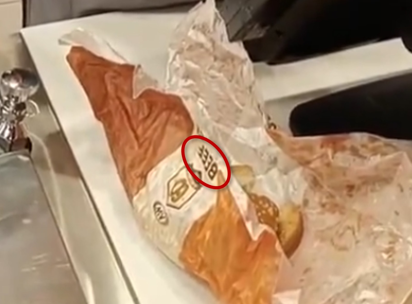 而镜头也拍到柜台上,放着一个已经打开包装的汉堡,包装纸上写着牛肉“beef”,而汉堡也明显被咬了一口。