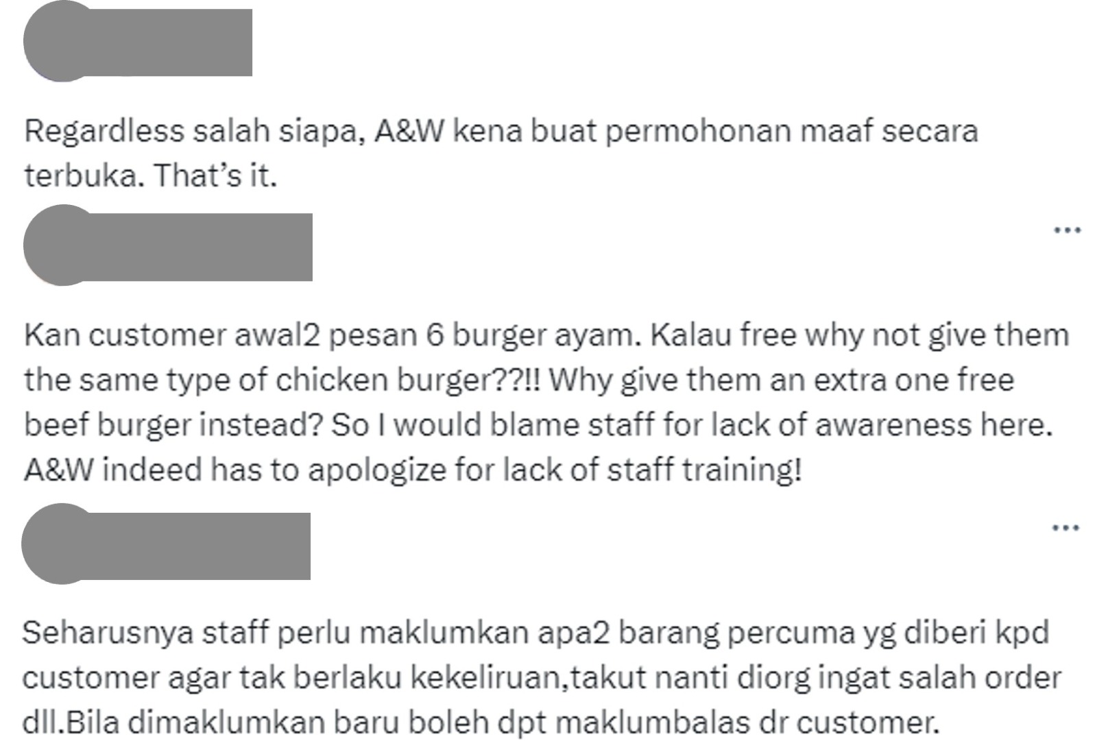 Customer India beli 6 burger ayam, dapat 1 burger beef for free from A&W.