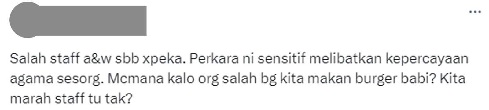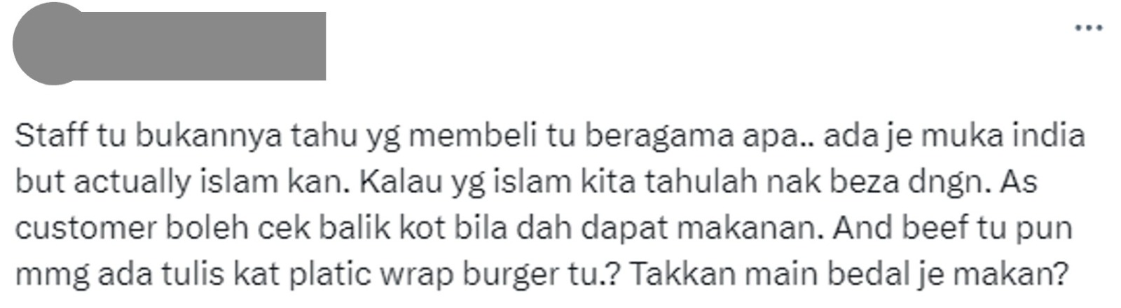 “这名员工错在不够敏感,毕竟这是涉及到宗教信仰的问题。如果有员工不小心给我们(巫裔)吃到猪肉汉堡,我们是不是也会责怪该员工?”