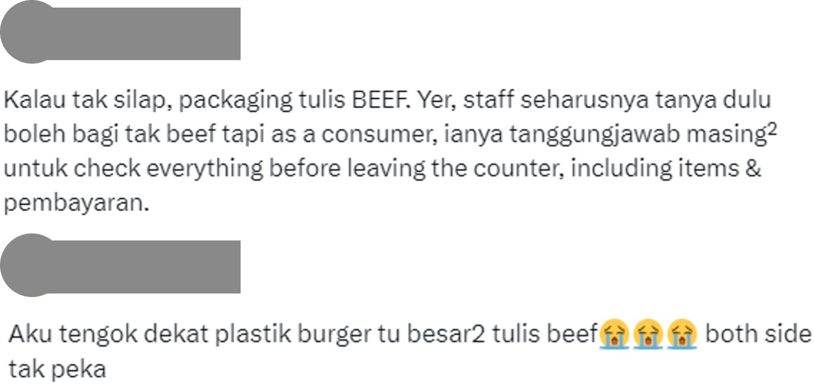 Staff tak inform customer dapat free burger and masukkan dalam takeaway packaging. Balik rumah customer tak perasan and termakan burger beef tu.