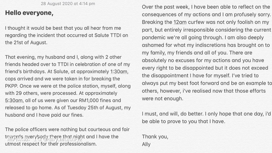 前吉打州务大臣慕克里的女儿及女婿早前到酒吧庆生,因违反复苏式管制令而遭罚款RM1,000。昨天艾丽雅娜(Meera Alyanna Mukhriz)在IG上公开道歉,并述说这起事件。