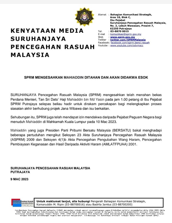 根据反贪会文告,慕尤丁今天到反贪会总部录口供后,并在下午1PM逮捕他,以调查Jana Wibawa计划弊案。