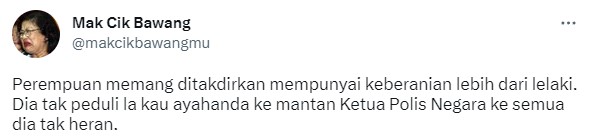 Perempuan memang ditakdirkan mempunyai keberanian lebih dari lelaki. Dia tak peduli la kau ayahanda ke mantan Ketua Polis Negara ke semua dia tak heran. pic.twitter.com/3hCZipa5LX