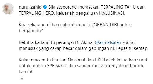努鲁希达雅在Instagram发文嘲讽三苏依斯干达,对峇眼拿督国会议席在上届大选的投票结果,产生幻觉。