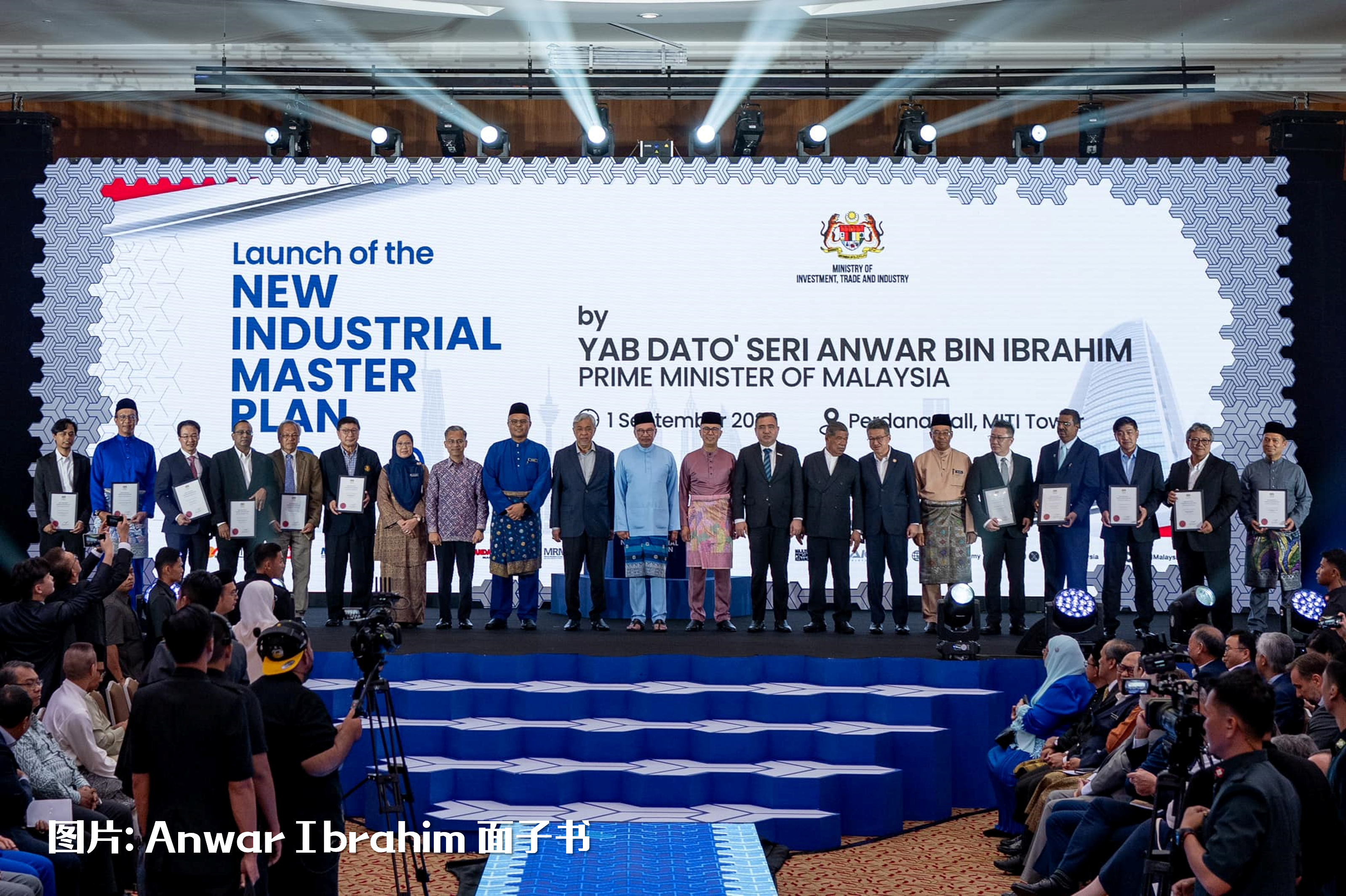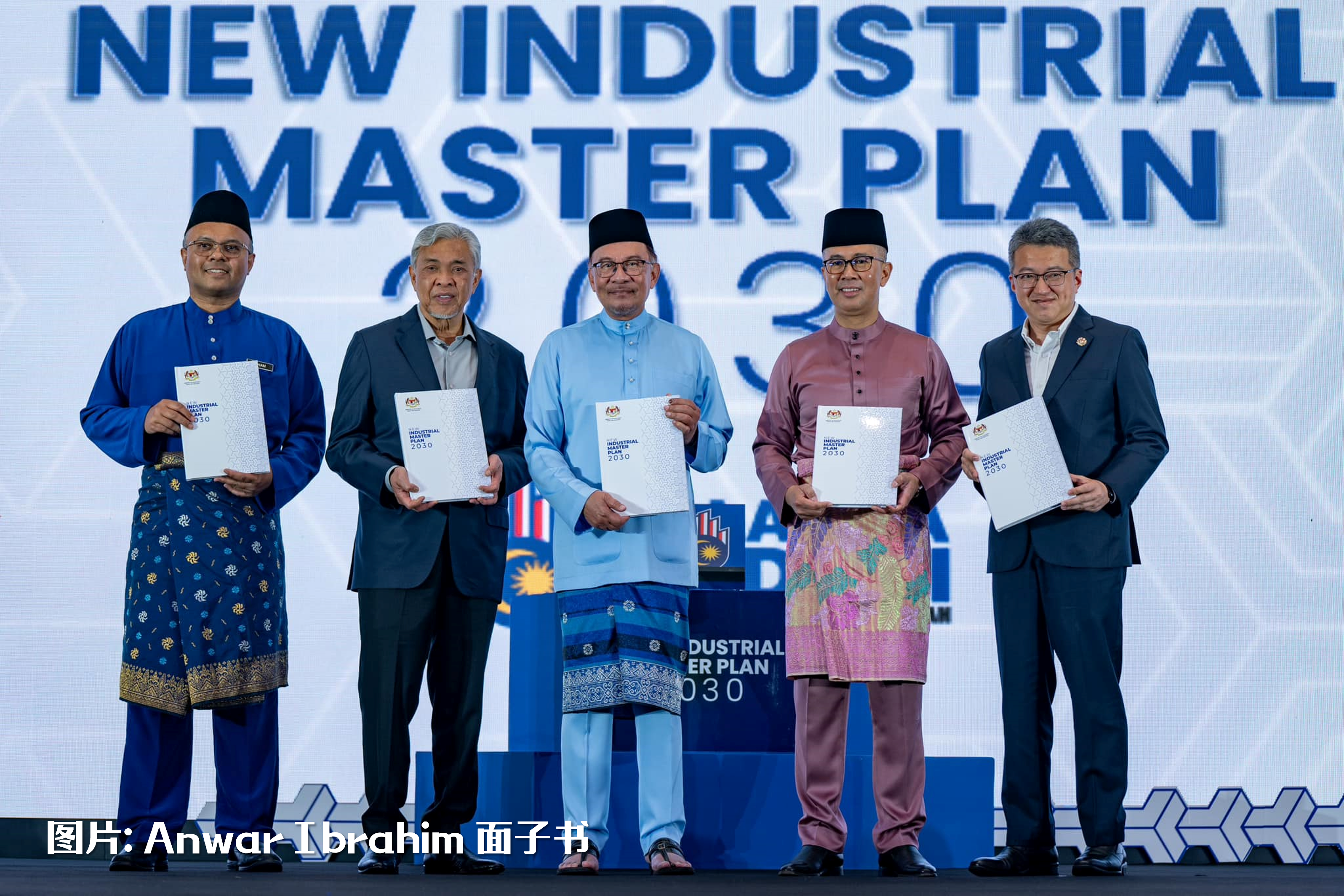 安华在多名内阁成员,包括副首相阿末扎希、贸工部长扎夫鲁、交通部长陆兆福和农业及粮食安全部长末沙布等人的陪同下,推介《2030年新工业大蓝图》。