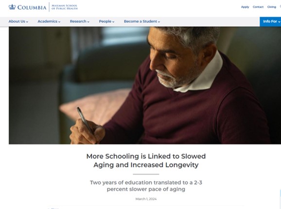 根据美国哥伦比亚大学梅尔曼公共卫生学院的研究团队在 “JAMA Network Open”杂志所发表的研究显示,教育水平的提高与减缓衰老速度和降低死亡风险之间有联系。