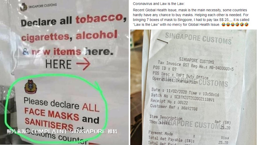 一名网友在社交媒体上传照片指,本月11日入境新加坡关卡时,因为携带7盒口罩入境,而被迫缴付约RM76税务。有网友认为,新加坡政府征税做法不对;但也有网民认同征税,并称如果每个人带7包口罩进来不抽税的话,那进口商就没得混了。