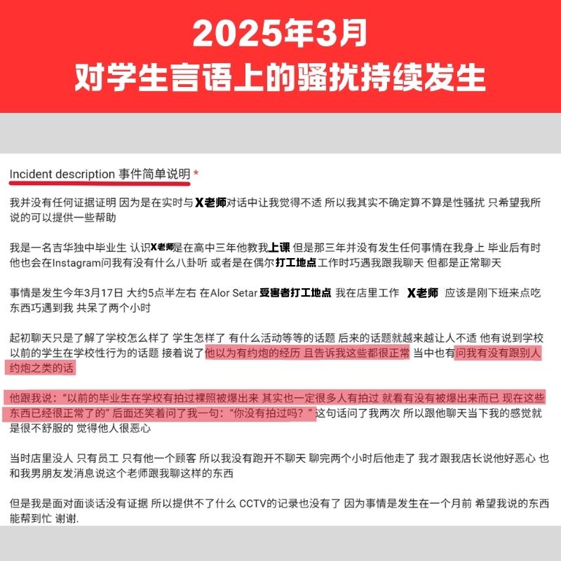 其中一位受害者表示,她在 2025 年 3 月 17 日与该教师在打工地点偶遇,对方与她聊了 2 个小时,内容从学校活动逐渐转向令人不舒服的话题,包括透露以前有学生在学校发生性行为,甚至有学生拍摄裸照。该教师还笑着问她:“你没有拍过吗?”
