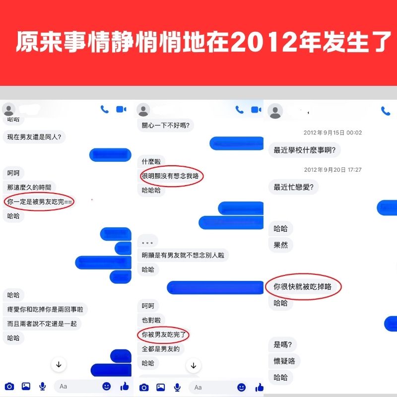 根据“资料收集行动小组”上传的多张聊天记录截图,最早一则可以追溯回2012年,内容显示男教师和学生暧昧的对话,男教师不仅越界关心对方的感情事,还频提醒学生会被男友“吃”了。