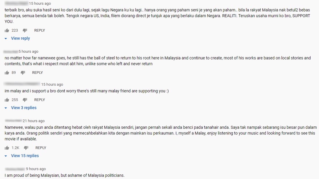 虽然作品出现反对声音,但黄明志的影片底下也迎来了不少马来网民的力挺,纷纷留言指称“自己为身为马来西亚人而感到骄傲,但为我国领袖感到耻辱”。