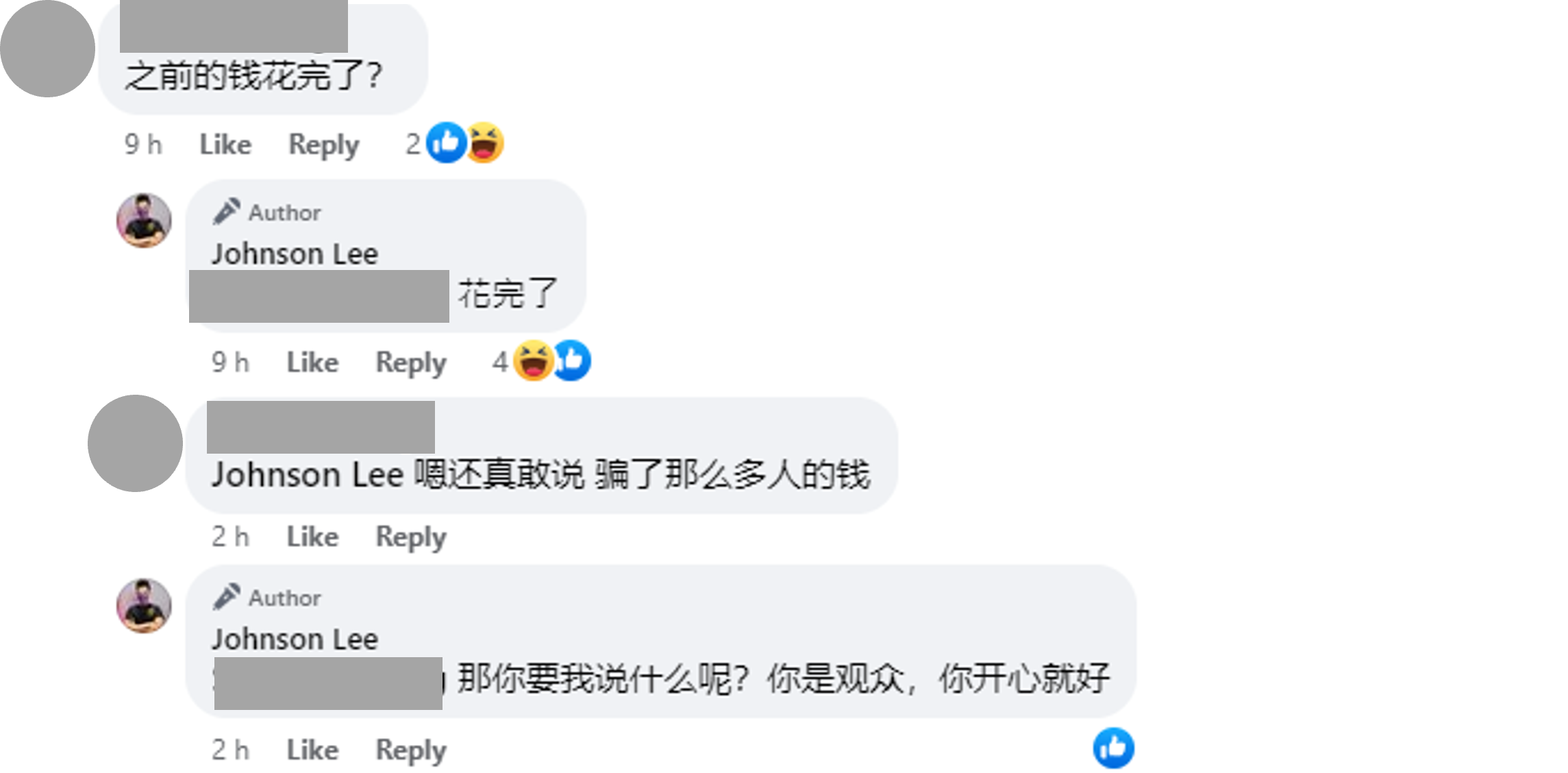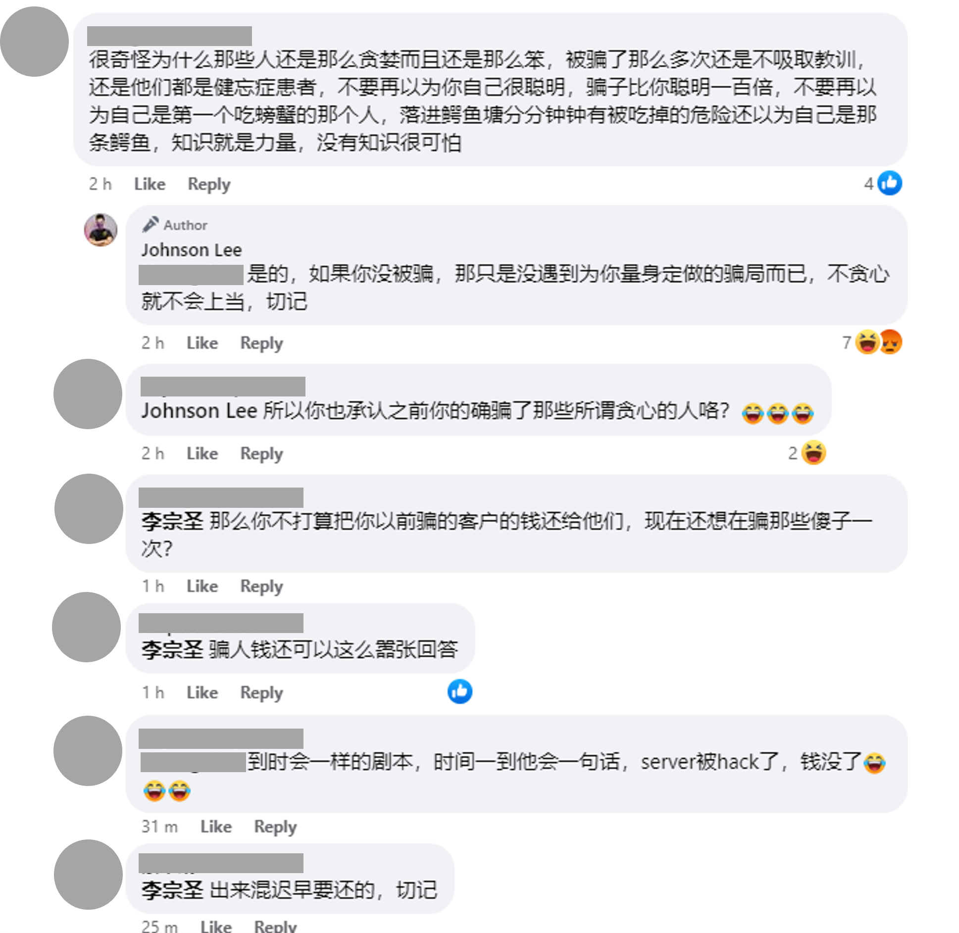 对于有网民提醒他人勿再掉入同样的陷阱,李宗圣更是正面回击,同样引用《孤注一掷》台词回应,讽刺留言者说,他还未被骗是还没有遇到为他量身定做的骗局,引起另一人感叹“骗人钱还能这么嚣张回答”。