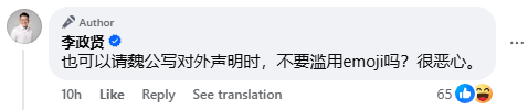 不仅如此,李政贤还在贴文下方留言,促请魏家祥在发表声明时,不要滥用表情符号。