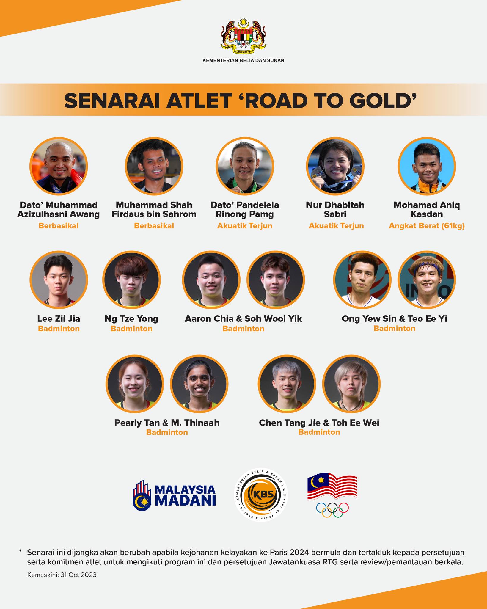 而此前入选“金牌之路”计划的羽球混双陈健铭和赖沛君、吴埙阀和赖洁敏,及大马男子勾球队,皆因今年整体成绩不佳,而跌出名单外。