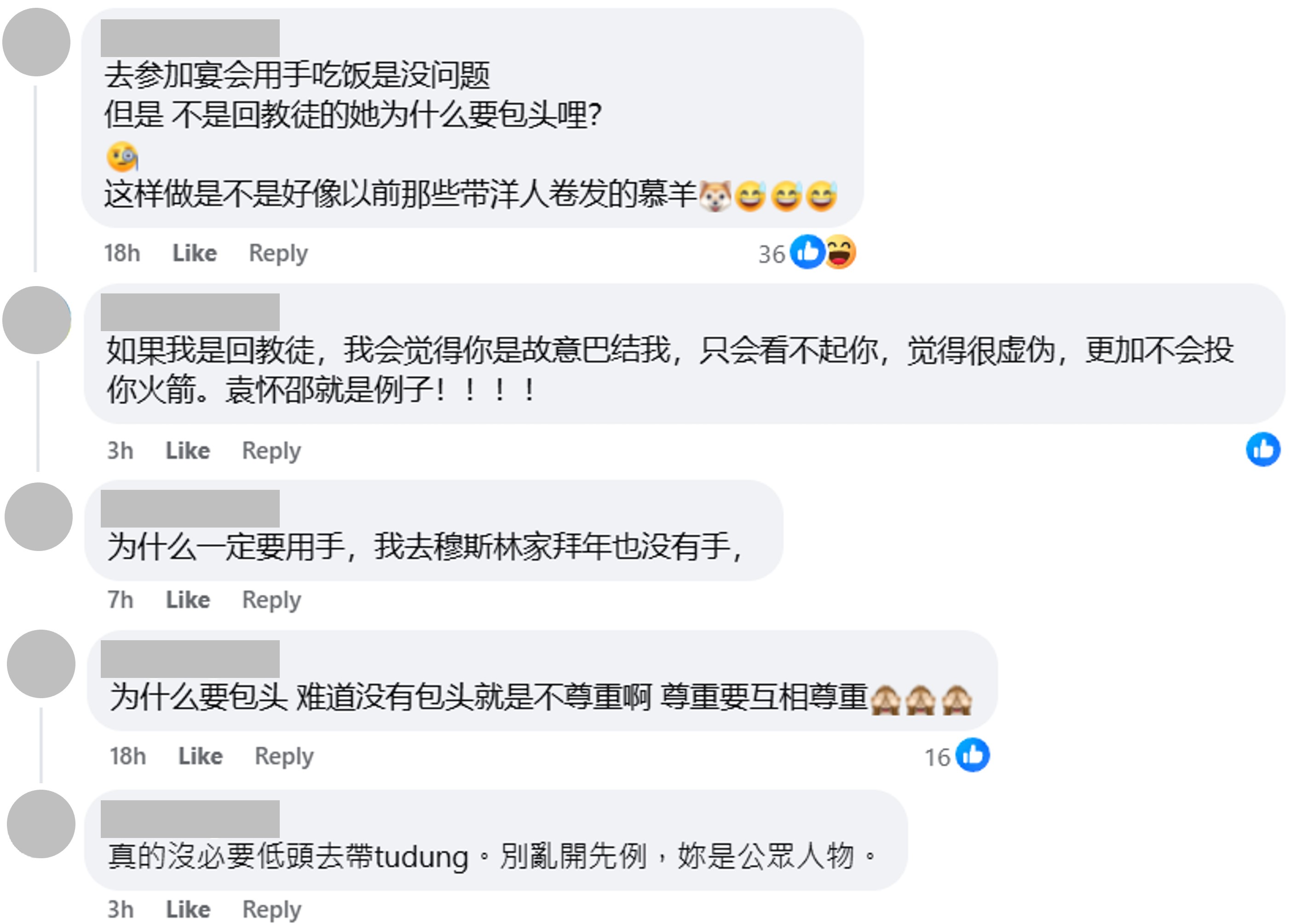然而,不少网民在这段影片的留言区冷嘲热讽,指杨美盈不是穆斯林,没必要戴头巾和用手抓饭进食。“去参加宴会用手吃饭没问题,但不是回教徒的她为什么要包头?”