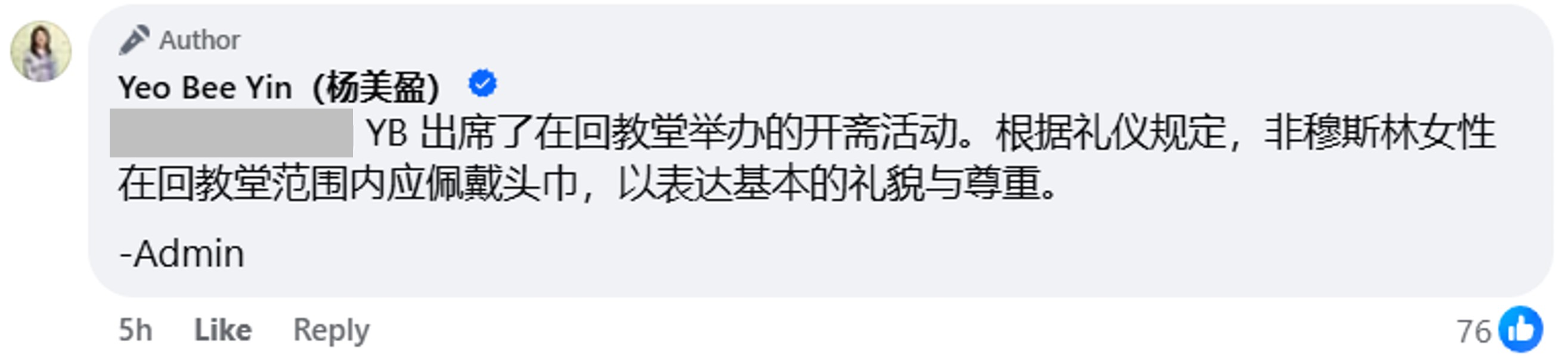 “YB出席了在回教堂举办的开斋活动。根据礼仪规定,非穆斯林女性在回教堂范围内应佩戴头巾,以表达基本的礼貌与尊重。”
