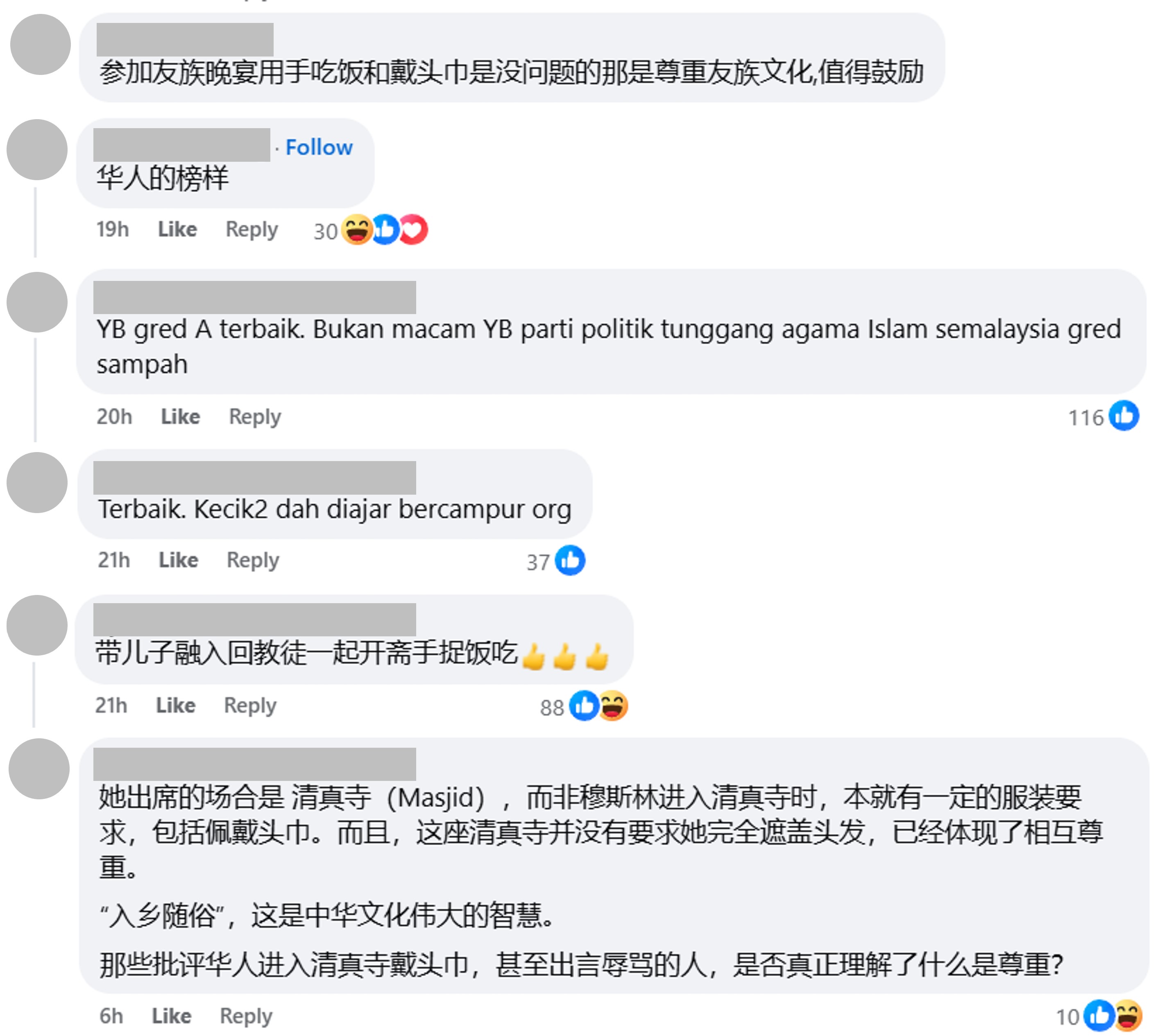 尽管如此,留言区依然有不少网民,包括巫裔网民留言,支持杨美盈的做法。“参加友族晚宴用手吃饭和戴头巾没问题,那是尊重友族文化,值得鼓励。”