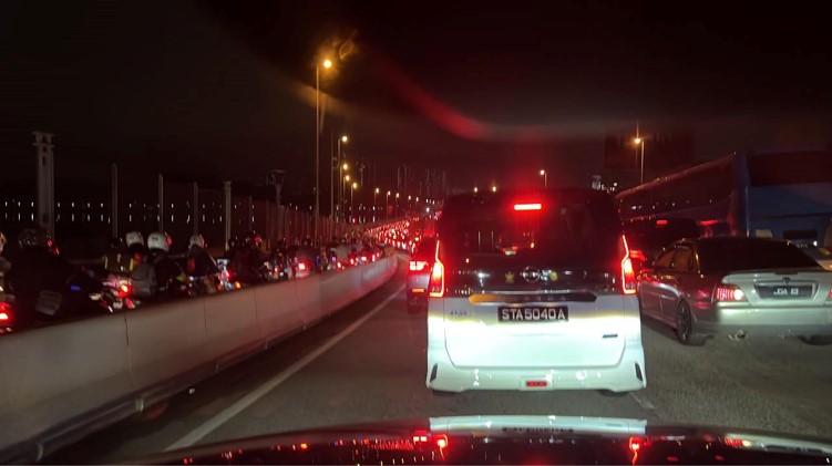 从照片上可以看到,马路上已经挤满了准备进入新加坡的车子和摩托大军,让贴主不禁摇头感叹:“夸张啊”。