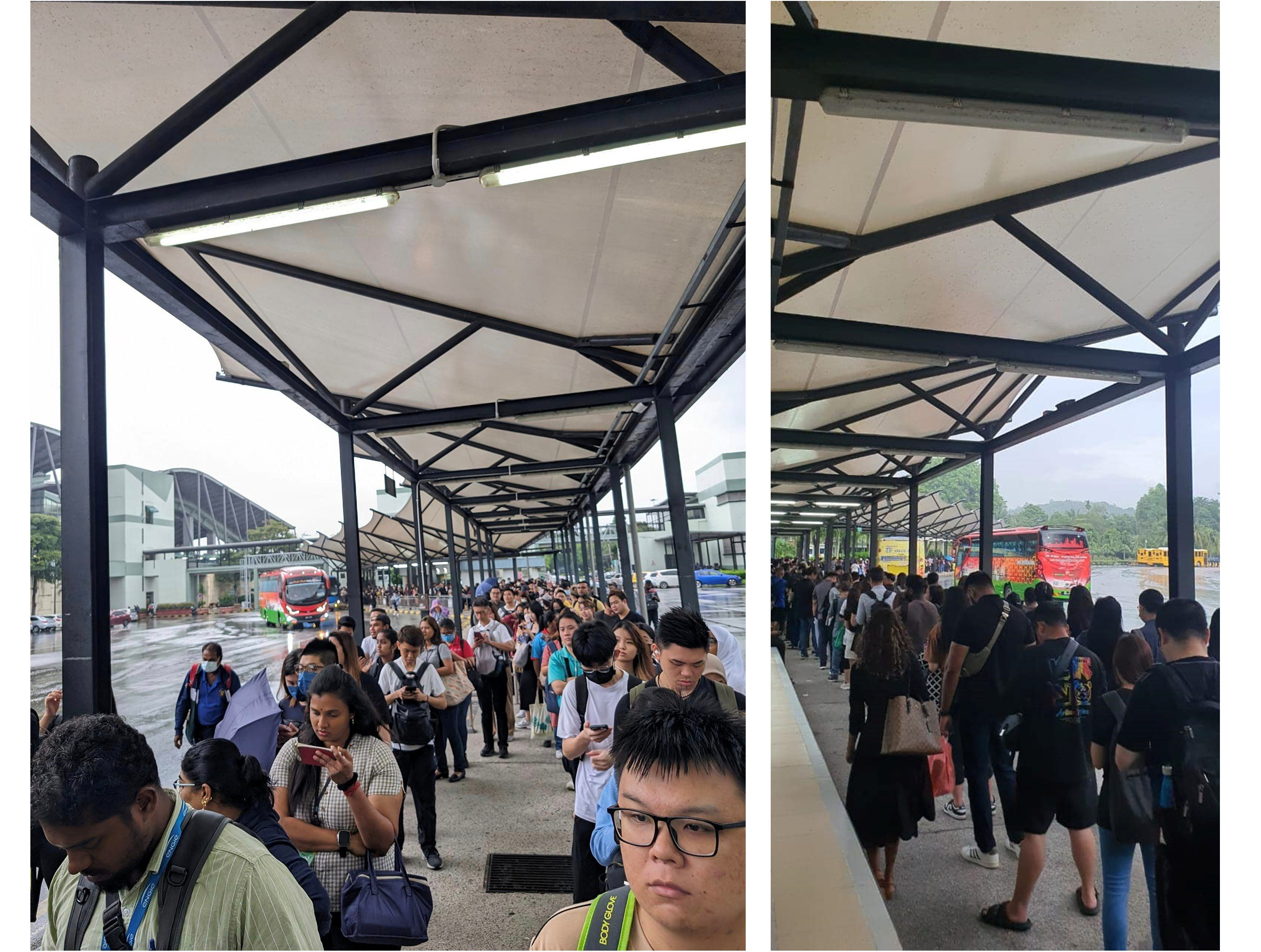 新柔关卡大塞车,不少人选择乘搭巴士代步到新加坡,不料在乘搭巴士前也需要“大排人龙”排队等巴士。大批越堤族今天一大清早穿着上班服,排队等候巴士。