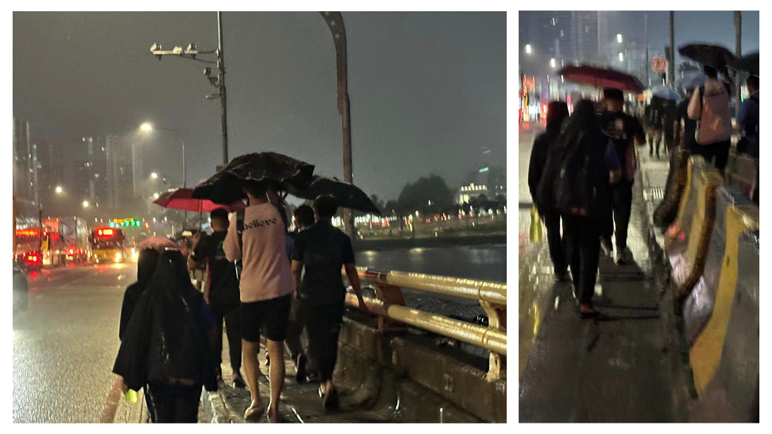 由于车辆占满了新柔长堤,一些越堤族也被迫走路通关。即便天空下起雨,他们也只好撑起伞走路过新加坡。