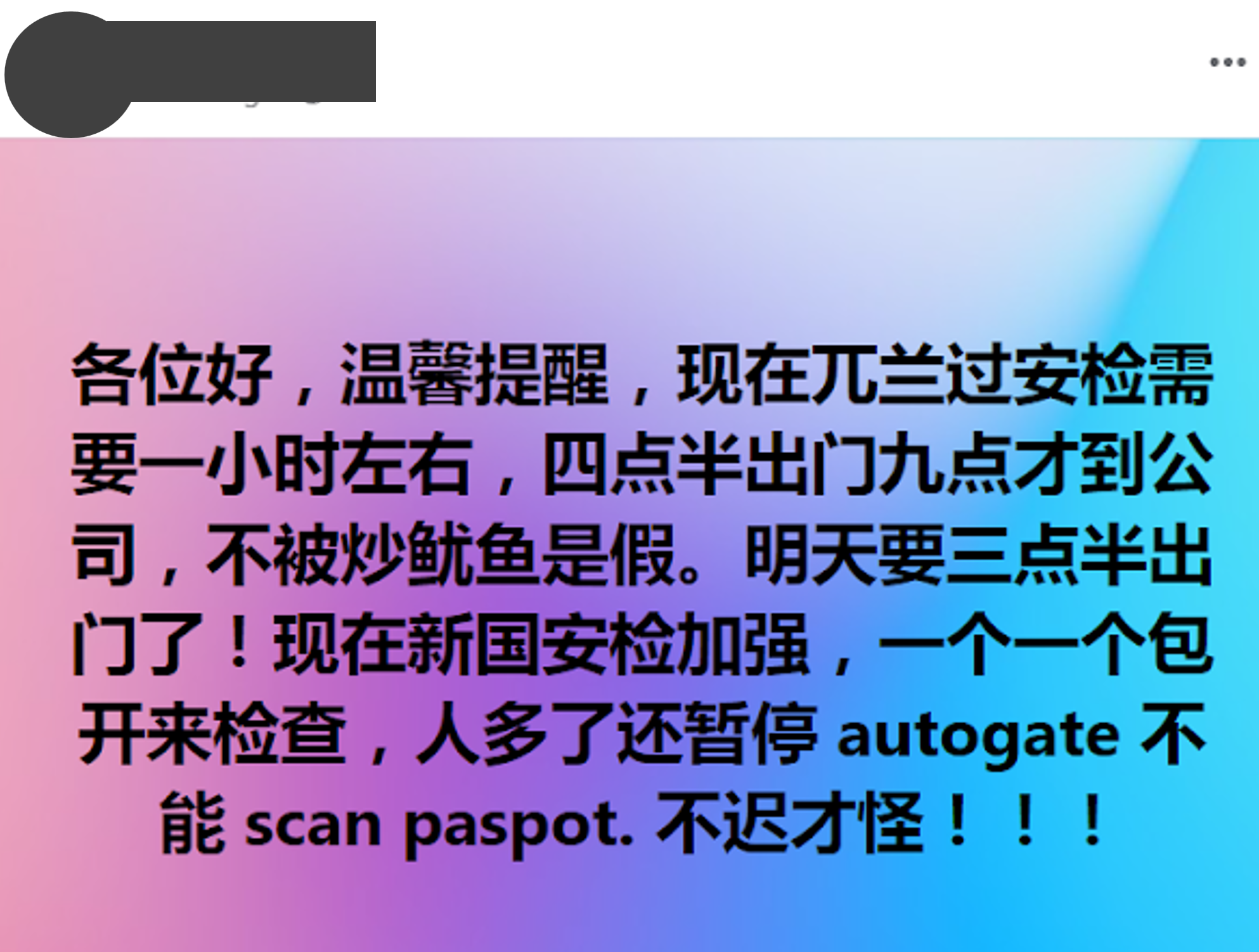 “单单是过兀兰关卡安检就需耗时1小时左右,关卡人员几乎每个包都打开来检查,甚至人多时,还暂停自动通关系统,不允许越堤者扫描护照 。”
