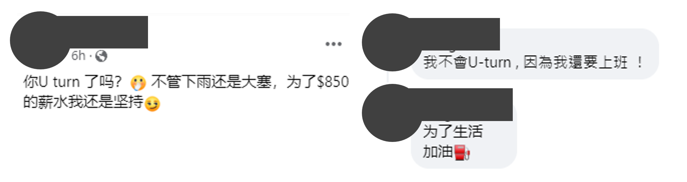 “你Uturn了吗?不管下雨还是大塞,为了$850的薪水我还是坚持。”