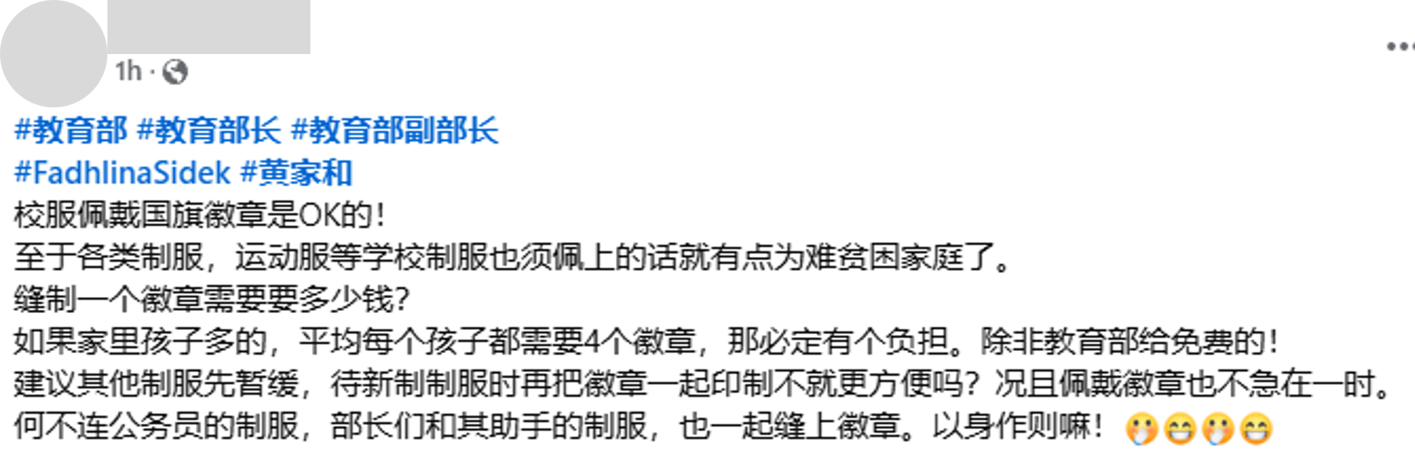 有网民甚至计算出落实这项政策的花费,称若一枚徽章要价RM2,全国共有约500万名学生,如果只计算1人1枚徽章,全国家长也需要花费约1,000万令吉。